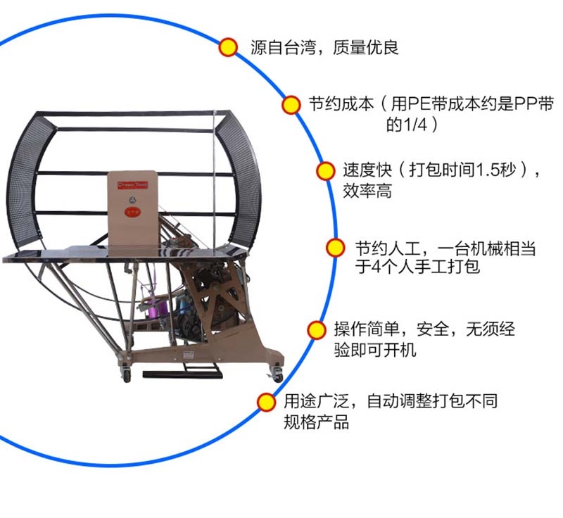 小機器大用途,使用本機可幫你減少人員工資支出(一臺機械相當于3-4人手工作),1.2秒可完成一個打結動作,加快工作流程,降低成本。此機使用PE環(huán)保透明軟繩對捆綁物品無污染、無損壞、捆綁出的物品整齊美觀,本機操作簡單、安全,無需經(jīng)驗即可開機,用途廣泛,自動調(diào)整捆綁不同規(guī)格產(chǎn)品。
